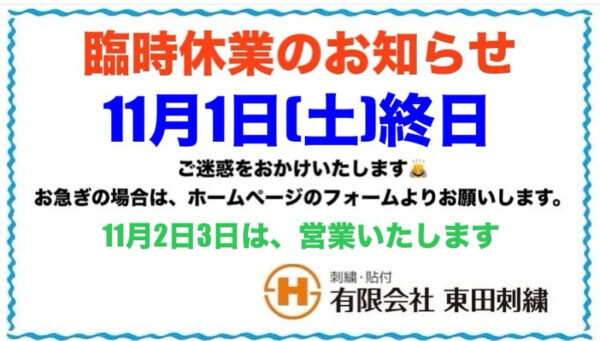11月1日臨時休業 11月2日3日は、営業いたします。